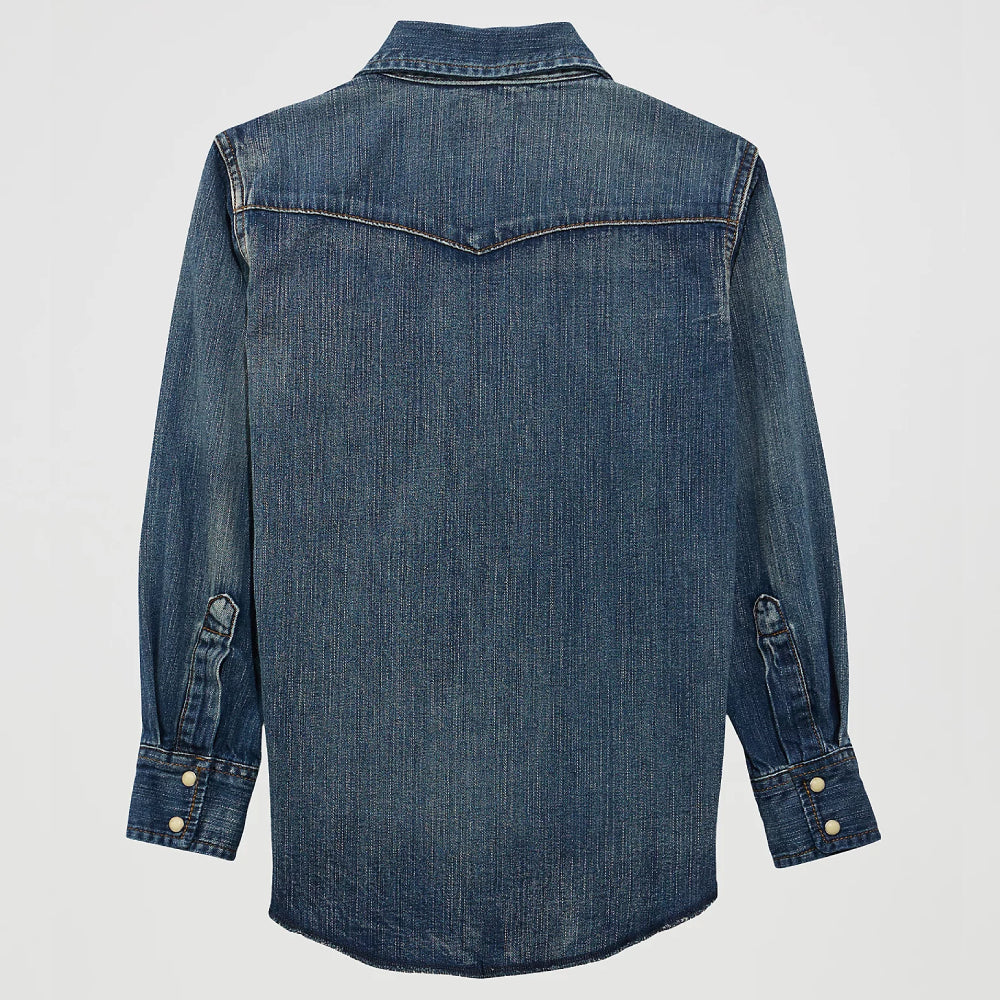 Just like Wrangler's men's version, so he can match his dad. This work-inspired denim snap shirt from our Cowboy Cut® collection features a spread collar, 'W' stitched flap pockets, and Western yokes. The washed blue fabric has a lived-in, authentic look. Finished with a riser label at the left pocket, so everyone will know it's Wrangler.