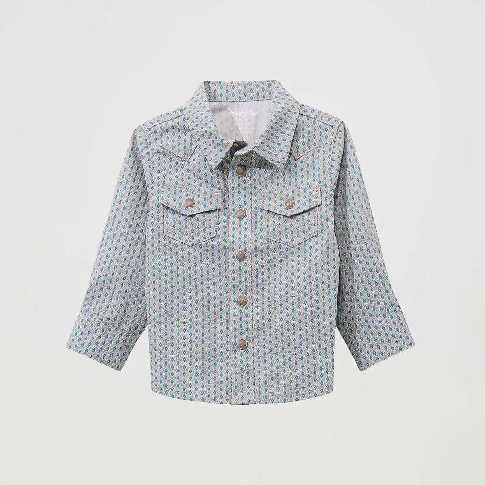 Handsome Wrangler Boys Print Western Snap Shirt. When you're getting your little ones immersed in cowboy culture, Wrangler® is your one-stop shop for kids' Western wear that's authentic and meets today's top trends. This striking baby boys' Western shirt features a stylish pattern, Western yokes and cuffs, flap pockets at the chest, signature Wrangler 'W' stitching, and pearl snap buttons.