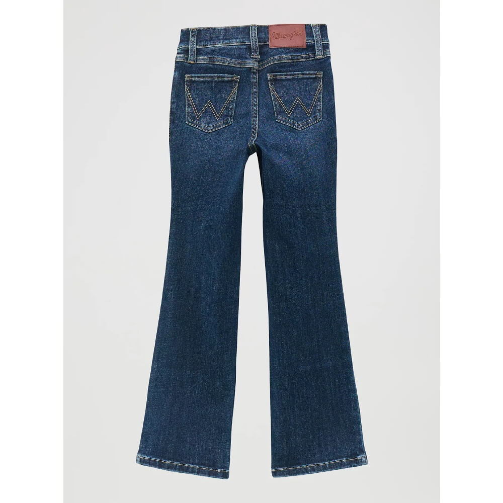 Essential Wrangler Girls Boot Bespoke Bootcut Jeans. Made to Move, Made to Grow. Keep her comfy and grounded in cowgirl flair with Girl’s Wrangler® Bespoke Bootcut Jean. Specially crafted from a cotton-stretch blend, these bootcut jeans offer excellent flexibility. Plus, they feature an adjust-to-fit waistband in sizes 4 – 6X to outlast growth spurts and stay in rotation longer than the typical jean. This classic bootcut also comes with the five-pocket styling, double-stitched ‘W’ embroidery, and a rope logo patch.