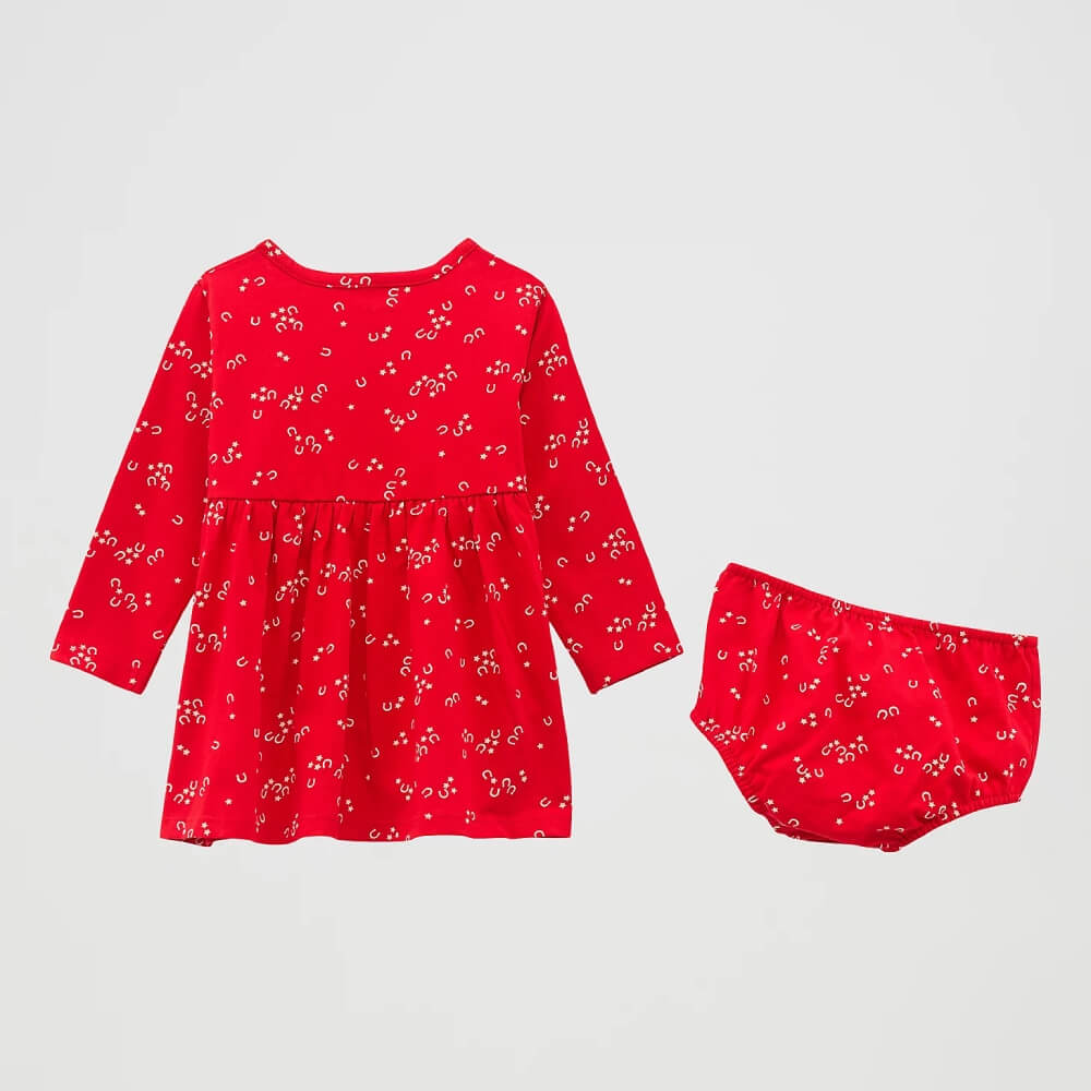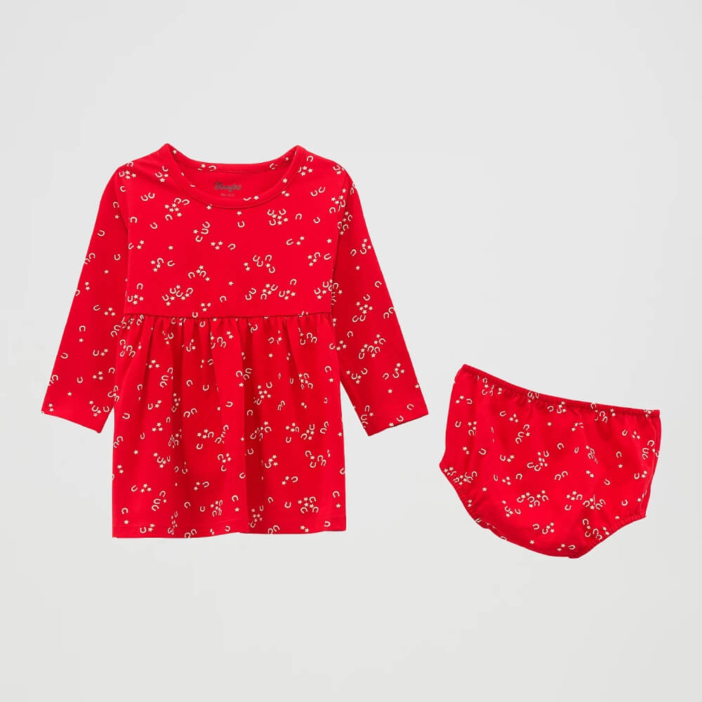 Turning every step into a lucky stride, Wrangler’s Little Girl’s Knit Western Dress offers a picture-perfect option for any young cowgirl. It’s made of cotton jersey to keep her comfortable as she explores this great big world. This long-sleeve dress features a starry print with horseshoes sprinkled in for some extra Western flair. It also comes with a matching diaper cover to complete the outfit.