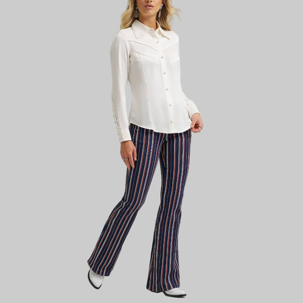 Authentic Wrangler Womens x Lainey Wilson Western Snap Shirt Star White. Lainey picked the styles that spoke to her core—the part that loves being a cowgirl through and through. And the Wrangler® x Lainey Wilson Embroidered Western Snap Shirt doubles down on all those Western details you love, including faux smiley pockets, curved yokes, and piped trim throughout.