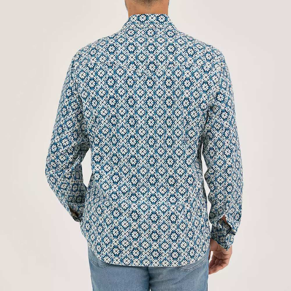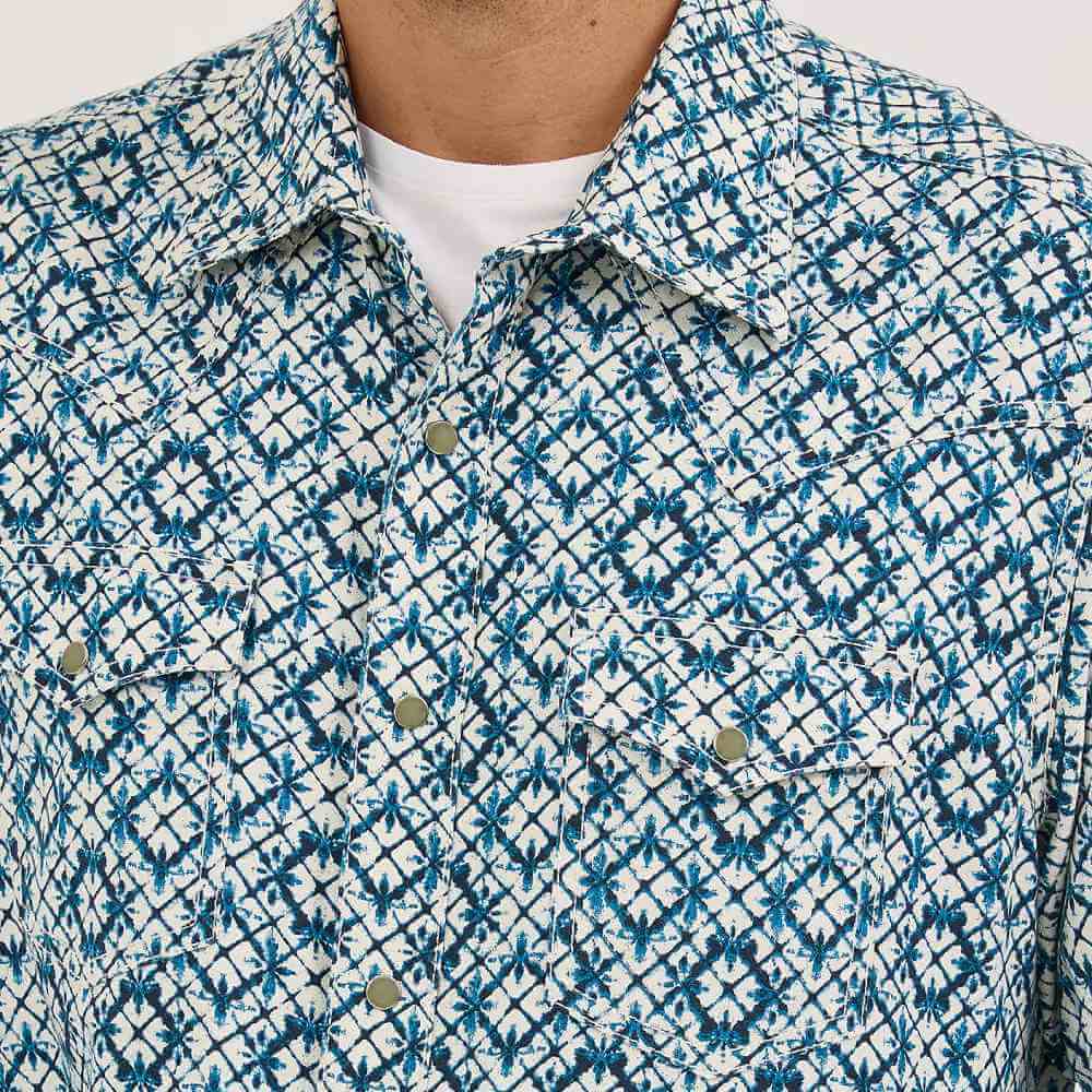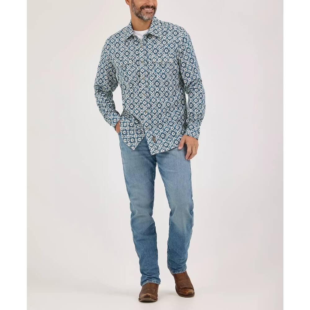 Look good while feeling good in the men's Wrangler Retro® long-sleeve western snap printed shirt. This contemporary take on the classic style you love comes packed with all the distinctive details, including pointed front and back yokes, single needle stitching at the placket, modern fit, contrast trim, two snap cuffs, and two chest flap pockets with snaps. This long-sleeve snap shirt features a modern fit and it's crafted from cotton for comfort, minimal wrinkling, and long-lasting looks. Complete the outfit with Wrangler Retro jeans.