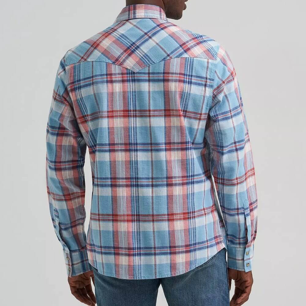 Wrangler men's Retro Premium long-sleeve western snap plaid shirt delivers all the authentic western styling you love but with a modern fit that's perfect for the contemporary cowboy. It's crafted from cotton for all-day comfort and long-lasting durability. Plus, it features pointed front and back yokes, contrast trim, snap cuffs, and a full snap closure. You can easily wear this long-sleeve snap shirt all year long, and it looks great layered over a white t-shirt.