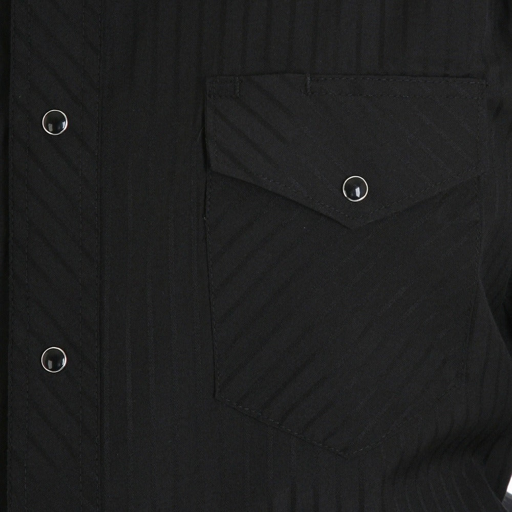 Essential Wrangler Mens Sport Western Snap Shirt. A true western classic Black tone-on-tone dobby stripe with black snaps and all the right features