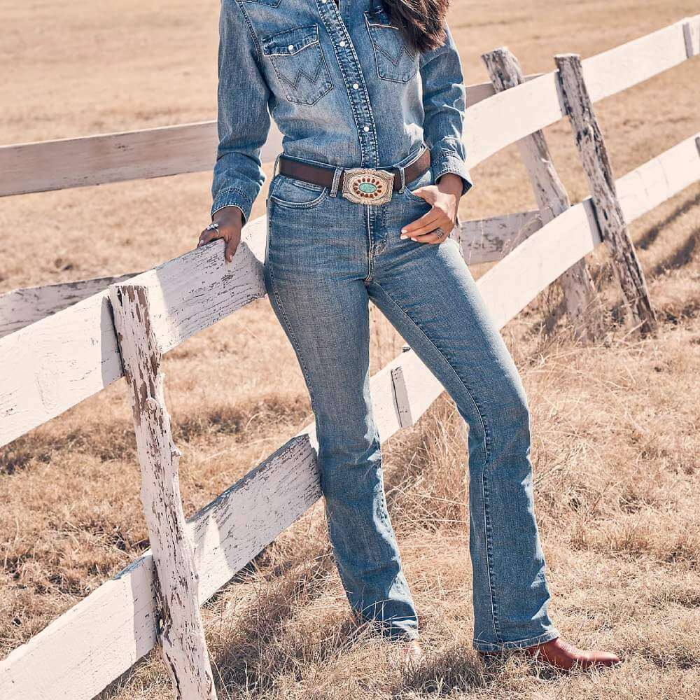 Essential Wrangler Womens Retro® Bailey Bootcut Jeans. Trends may come and go, but the boot cut is forever. Women’s Wrangler Retro® Bailey High Rise Bootcut Jean sets the bar high with a waist-nipping silhouette, a close fit through the thigh, and a slightly flared 17” leg opening that goes perfectly over boots. It’s crafted from cotton with just a subtle amount of stretch for comfort. Plus, the signature five-pocket styling, “W” stitching, and rope logo patch deliver the Western authenticity you want.