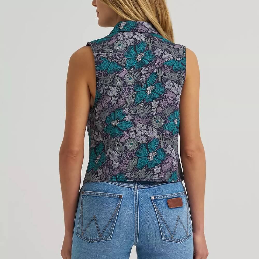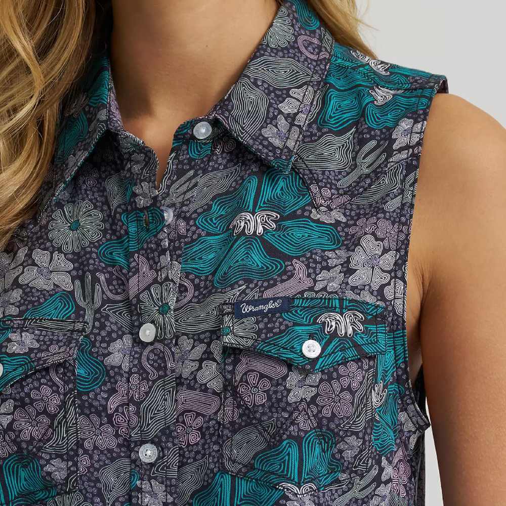 Offering the classic cowgirl look with a fresh twist, Wrangler’s Retro® Breezy Sleeveless Crop Western Snap Shirt will become an instant favorite. Comfortable and lightweight, it’s tailor-made for warmer weather and finished with a vibrant floral print that’s as lively as a summer rodeo. This shirt features a slimmed-down silhouette with authentic details, including single-point yokes, a button-front closure, and chest pockets with Wrangler’s signature ‘W’ stitching. Plus, it’s been cropped to the perfect length for pairing with your favorite high-rise styles.