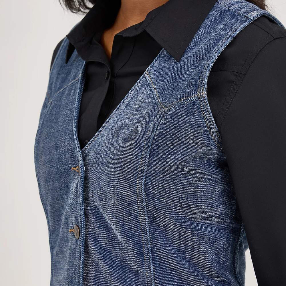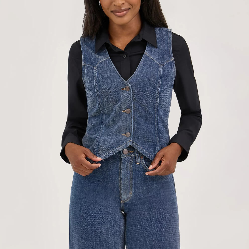 Here’s a versatile way to wear your favorite true-blue look— Wrangler Women’s Western Denim Vest. This iconic layering piece comes with a slim fit, a slightly cropped silhouette, and an angled hem across the front. Just like your favorite Wrangler® tops, it features the single-point yokes from front to back and antiqued hardware to complete the look in authenticity.