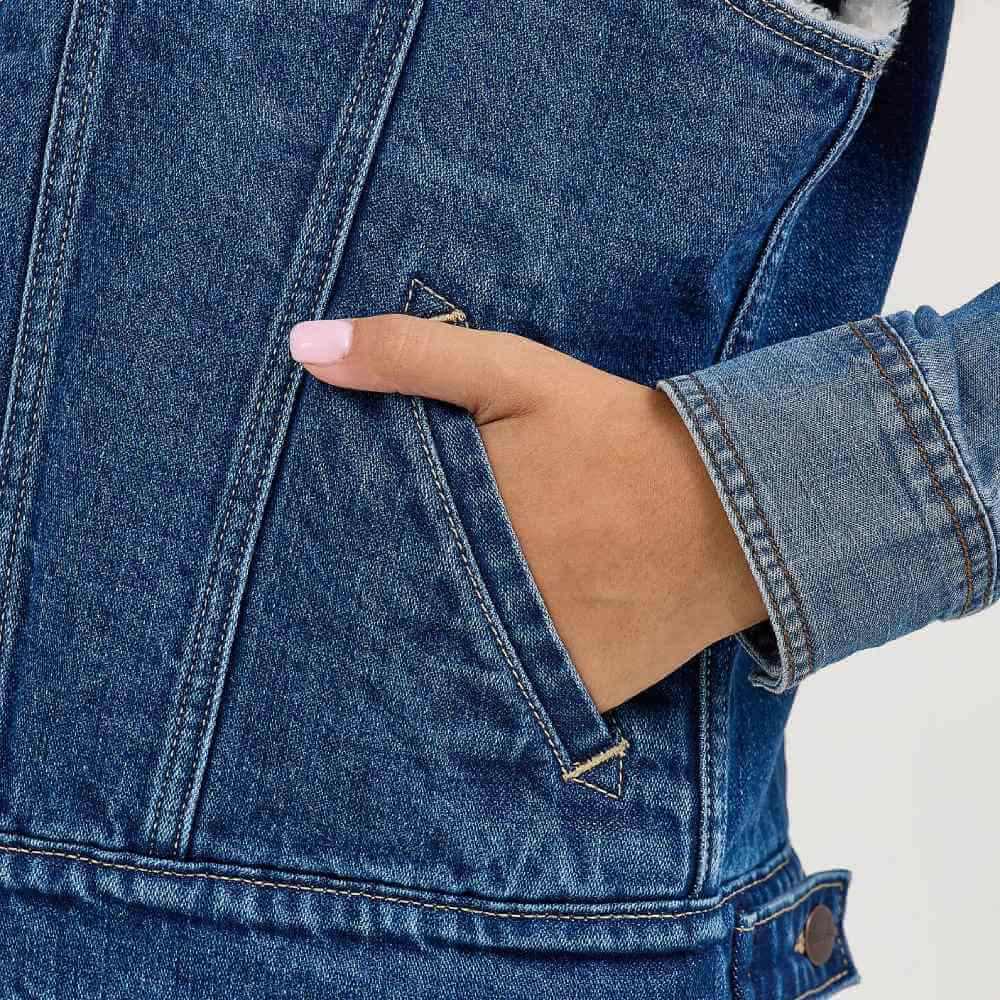Essential Wrangler Womens Denim Vest Mid (Blue-Dark). If you’ll take any opportunity to cozy up, Women's Wrangler Retro® Denim Vest is just too good to miss. This dreamy denim statement piece has all the iconic details of a classic trucker jacket, except for sleeves, of course. It features a single-point yoke across the back for a Western-inspired feel, chest flap pockets with Wrangler’s signature ‘W’ stitching, an angled pocket at each side, and antiqued copper hardware.