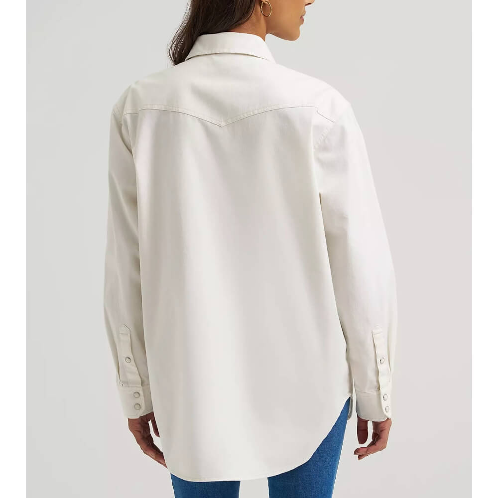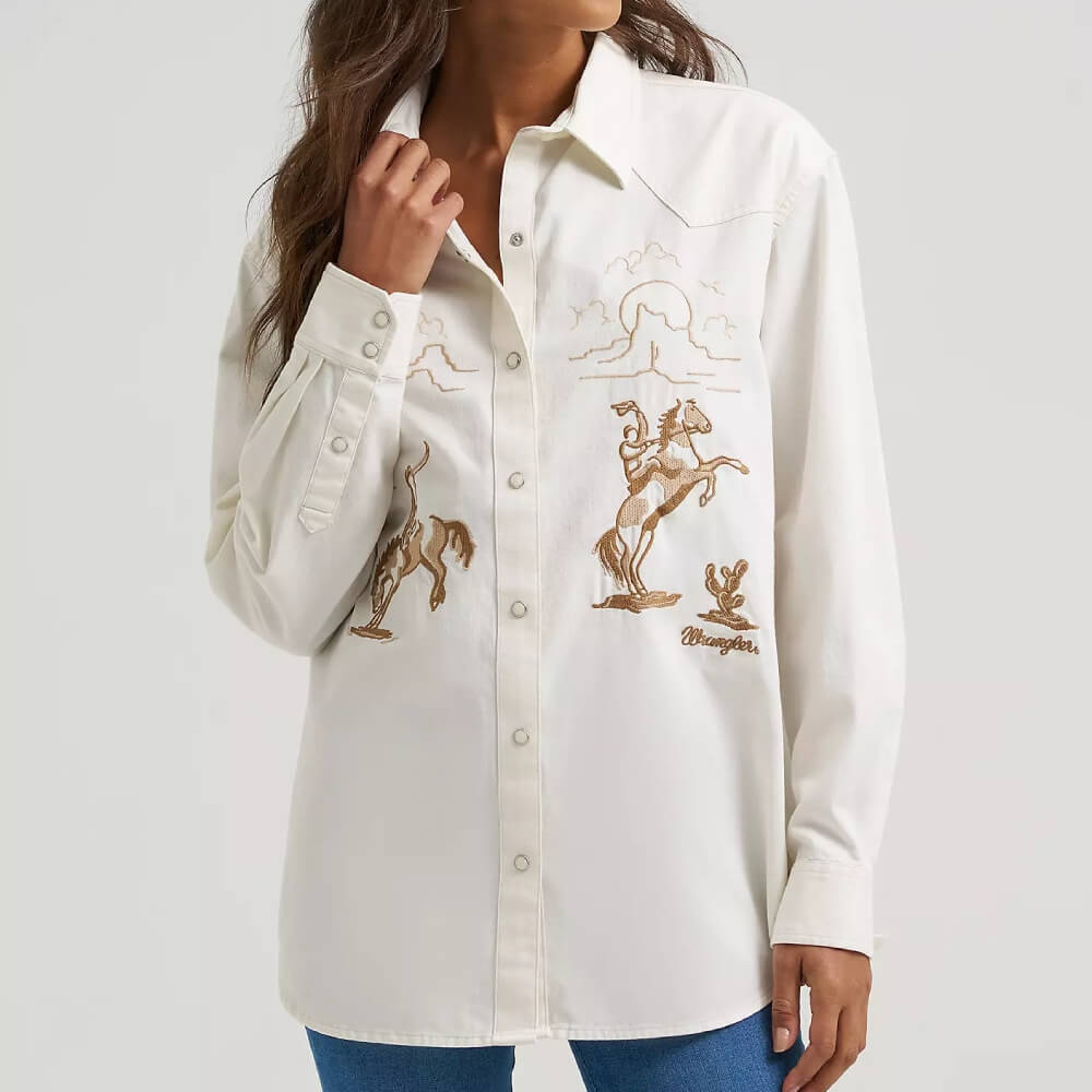 This Women’s Wrangler Retro® Embroidered Boyfriend Western Snap Denim Shirt pays tribute to the time-honored tradition of horse training and rodeo. It features embroidered artwork of a bronc rider in a round pen on one side and a cowboy riding a rearing horse on the other side, with mountains in the distance. This lightweight denim shirt is crafted from 100% cotton and finished with pearl snaps for an authentic cowgirl look. Best of all, its boyfriend fit offers that broken-in feeling right from the start.