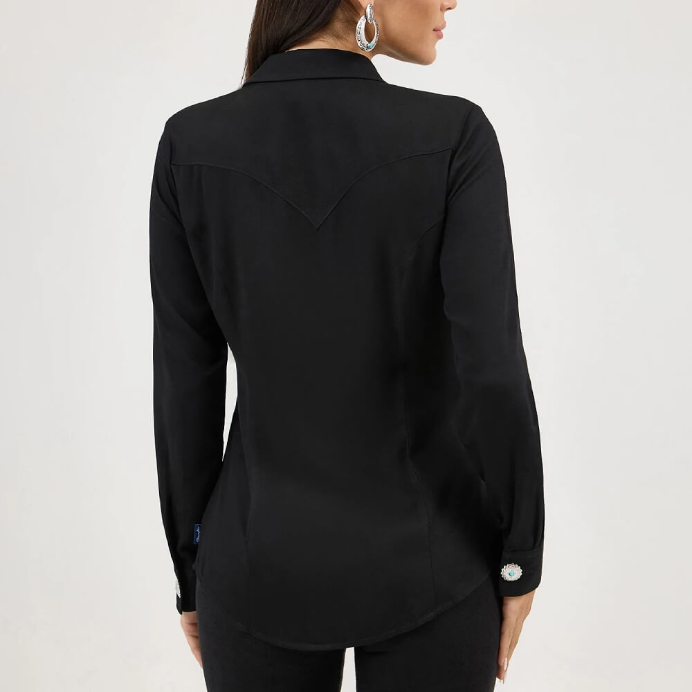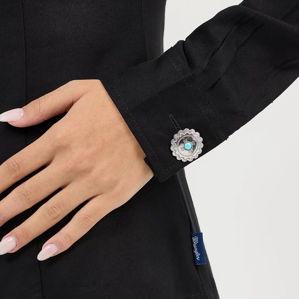 Unique Wrangler Womens Slim Concho Button Shirt. Who needs all those bells and whistles when you can have the most iconic statement piece? We’re talking conchos, and Wrangler’s Women’s Slim Concho Button Shirt does all the accessorizing for you. It’s crafted from a soft and silky fabric you’ll love wearing all year long. This iconic collared shirt comes with single-point yokes from front to back, a slimmed-down silhouette, and shiny concho buttons with turquoise-colored stone inserts. Tucked or untucked, this shirt will elevate every outfit.