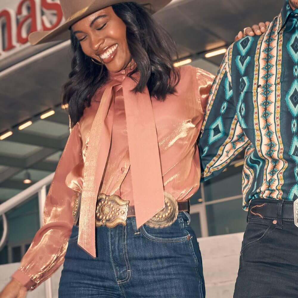 Beautiful Wrangler Womens Shimmer Tie Neck Blouse Rose Gold. Bring some extra razzle-dazzle to any occasion with Wrangler’s Women's Shimmer Tie Neck Blouse. It’s crafted from a lightweight and ultra-soft fabric blend, with a glimmering rose gold color that will instantly elevate any outfit. Don’t worry—the cowgirl flair’s there with a Western back yoke, a full button front, and a neck tie you can wear in a ladylike bow or leave long and loose. Tuck it in, leave it untucked, this top will steal the show either way.