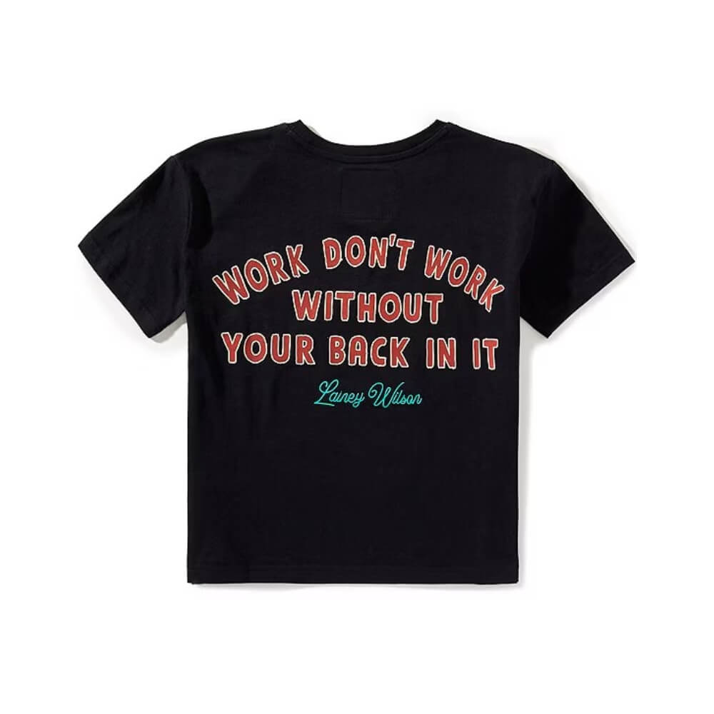 • "Work Don't Work Without Your Back In It " verbiage and scripted Lainey Wilson logo detail on the back