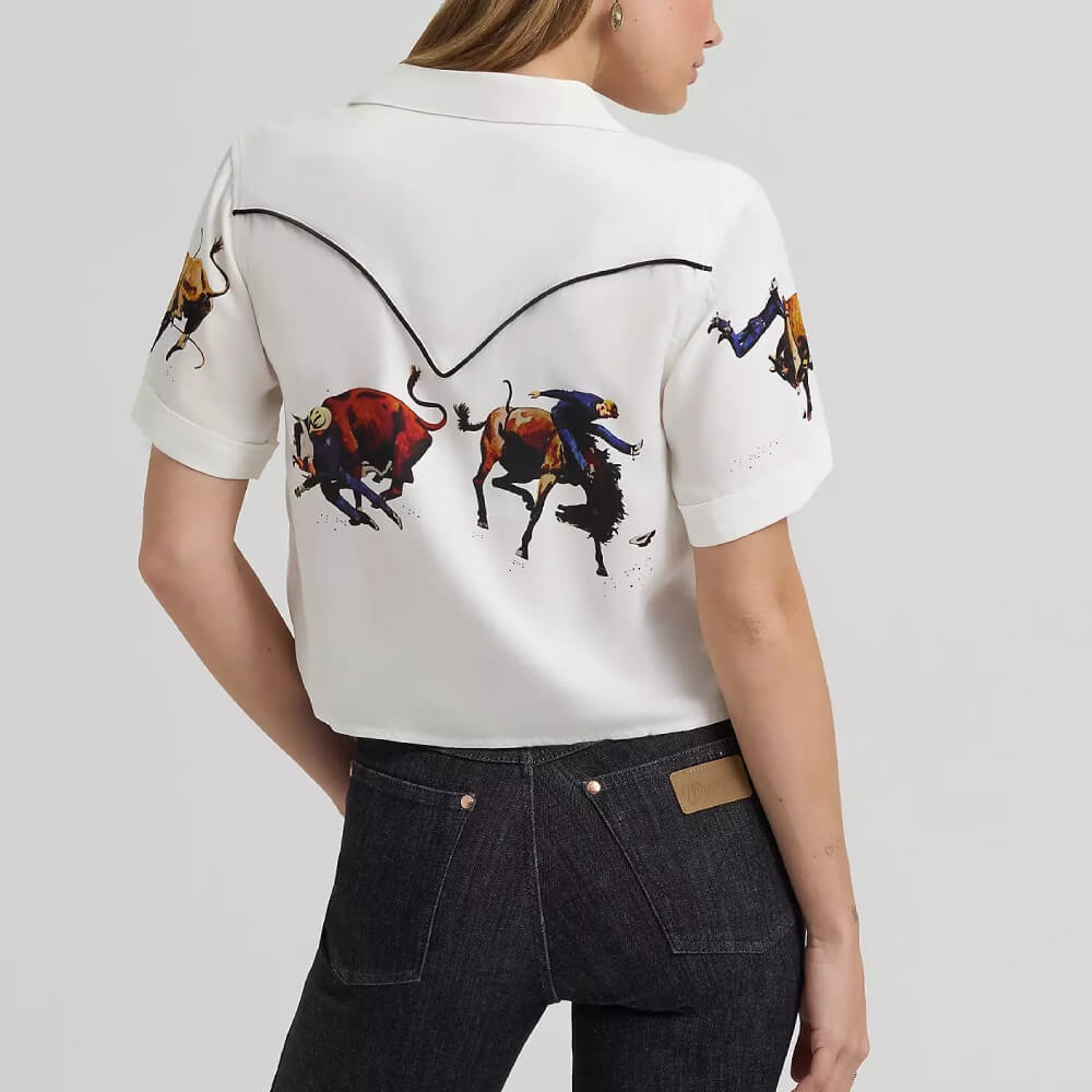 Blending laidback style with vintage cowgirl flair, the Lainey Wilson x Wrangler® Camp Shirt will be one you’re wearing on repeat. It’s woven from a soft fabric that’s perfect for warm days, with a slightly cropped silhouette offering a boxy, effortless look. It comes with an open lapel collar, pearl snaps, piped trim along the pointed yokes, and vintage-inspired artwork featuring rough stock riders in action. You’ll find Lainey’s embroidered initials at the hem, nodding to just how hands-on she was in creating each collection piece.