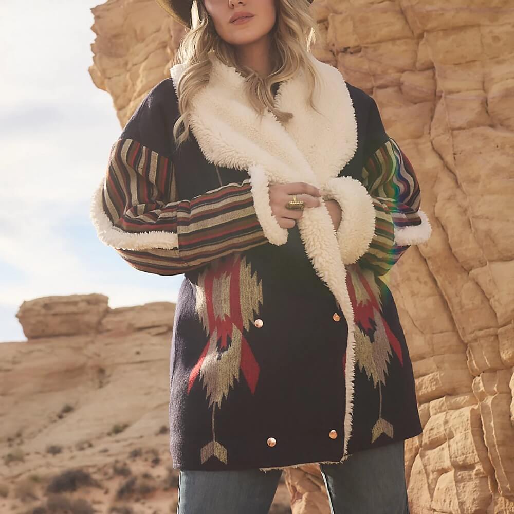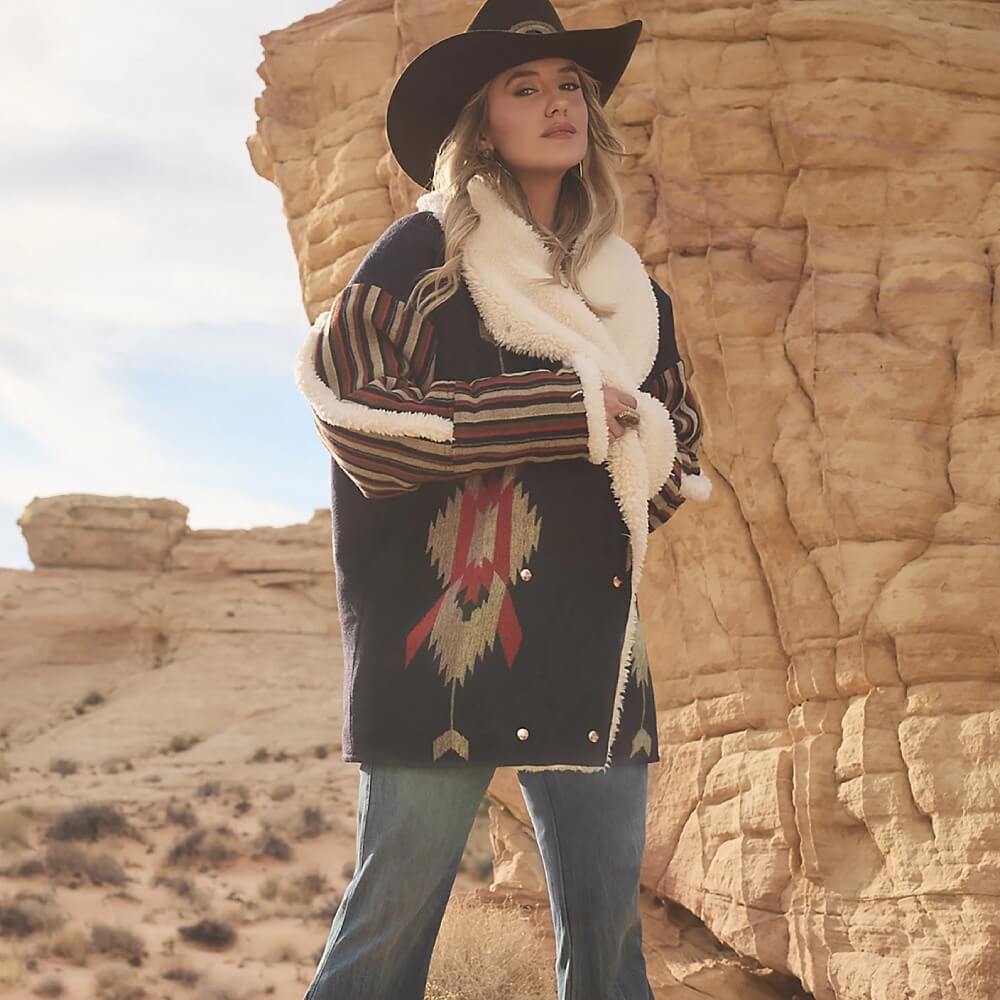 Authentic Wrangler x Lainey Wilson Womens Jacquard Lainey Coat. Cozy up in true cowgirl fashion with this Wrangler® x Lainey Wilson Jacquard Coat. It features a longline silhouette, a double-breasted placket with shiny copper hardware, and a Western-inspired jacquard design. It comes with dropped shoulders and an oversized fit that’s perfect for layering over anything and everything in your closet. You’ll also find an inner woven label with Lainey’s signature, nodding to just how hands-on she was in the creation of each collection piece.